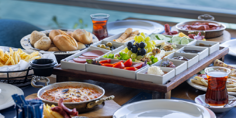 Çeçil Peynir, Beyaz Peynir, Taze Kaşar Peyniri, Eski Kaşar Peyniri, Nestle Çikolata, Reçel, Zeytin, Özel Bal, Tahin, Pekmez, Acuka, Kaymak, Domates… (ve daha fazlası)